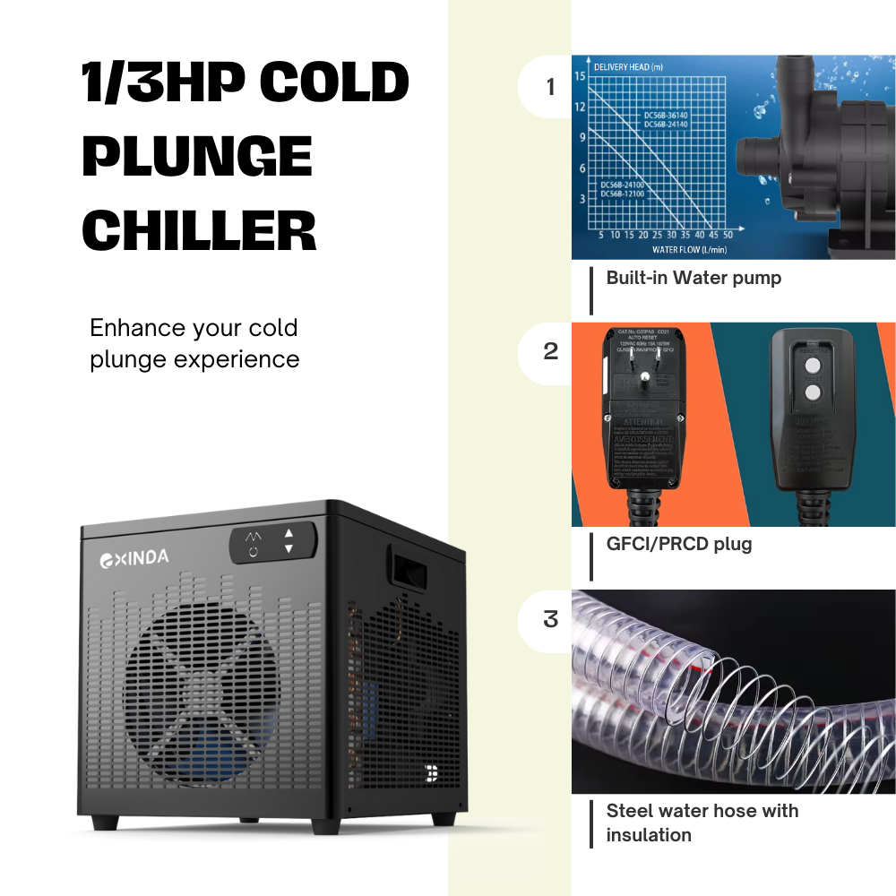 With EXINDA 1/3 HP cold plunge water chiller, you can cool water down to 39 °F without adding ice. suitable for use indoors or outdoors, this energy-efficient ice bath water chiller will enhance your cold plunge experience, Portable chillers with rapid cooling technology for the ultimate cold plunge experience.